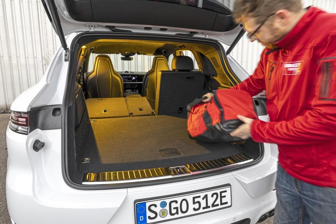 在后排座椅上,乘客也可以享受到舒適的外側支撐和寬敞的腿部空間,并使用從第一代車型開始就為Cayenne車主所熟悉的額外把手。得益于空氣懸掛系統,Cayenne還能在裝載貨物時降低車尾高度,并擁有較為細窄的裝載邊緣。唯一令人討厭的是,保時捷在行李廂中放置了一個手提箱大小的裝載袋,必須用登山扣將其固定,否則在高速轉彎時可能會對內飾板和充電器造成損壞。幸運的是,一根市面上常見的Type 2充電電纜可以存放在平坦的行李廂地板下,而Bose低音炮也位于此。然而,將后排座椅靠背折疊起來會與行李廂形成一個小的“峽谷”,這樣會導致日常使用過程中很多小東西可能會滑入其中。此外,E-Hybrid車型也沒有專門的空間用來放置行李廂上方的卷簾。