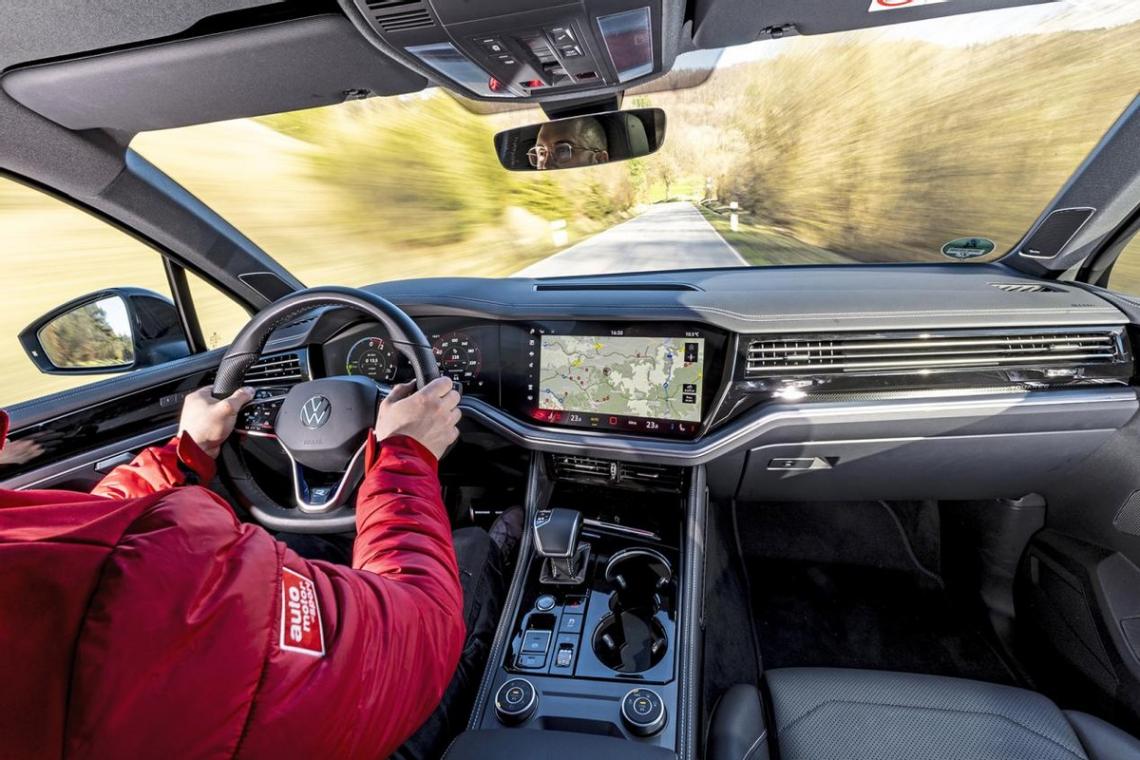 帶有按摩和加熱與通風功能的舒適座椅僅僅缺少了一點點橫向支撐。大眾對途銳R的駕駛動力性能十分重視:自適應空氣懸掛對車身側傾的抑制效果明顯,并明顯穩定了沉重的車身。途銳可以無縫地執行轉向指令,并能精確地保持所預想的行駛軌跡。難道大眾運用了什么魔法?是的,而且是“黑魔法”。因為倍耐力P Zero Corsa輪胎(需額外付費購買)就是實現這一目標的關鍵。扁平的運動型輪胎在過彎和繞樁時提供了明顯的幫助,但在濕滑路面上,這種尺寸的SUV顯然更適合使用其他類型的輪胎。而無論在何種情況下,電子穩定系統都會在極限狀態下進行嚴格干預。