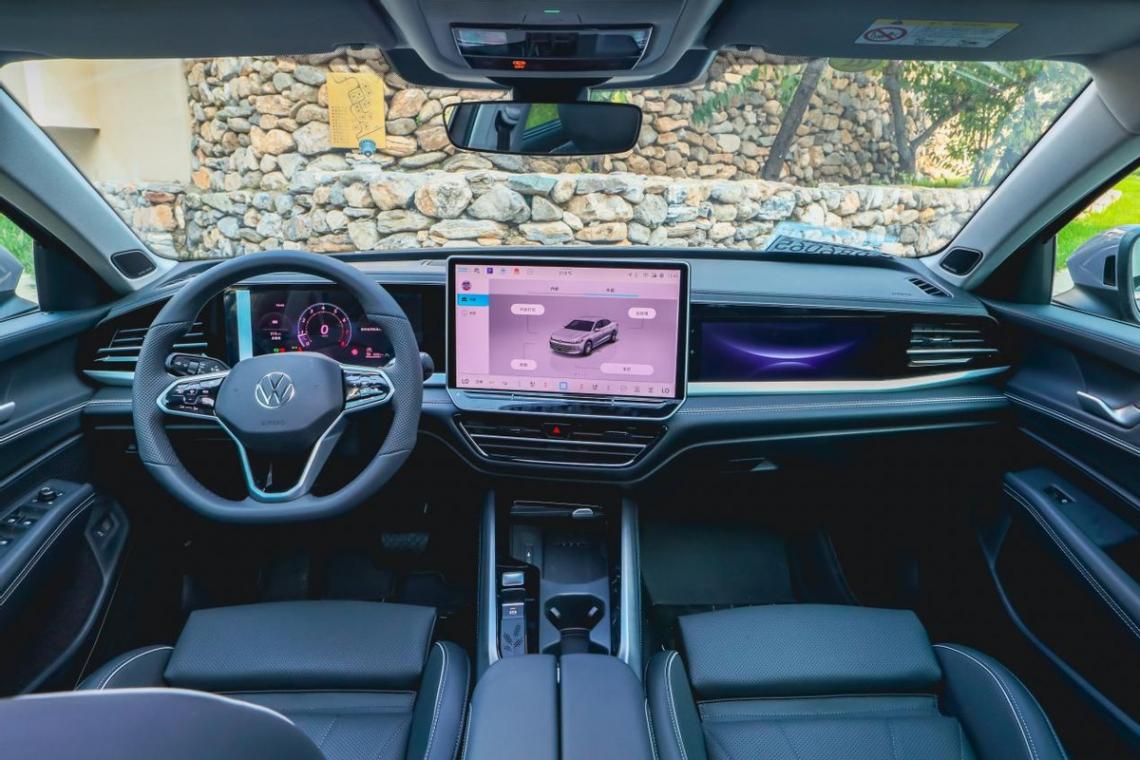 除了外觀調整外,車內升級也是非常明顯的。以帕薩特Pro為例,它擁有10.3英寸液晶儀表+15英寸中控屏+11.6英寸副駕娛樂屏幕的組合,無論是高級感還是科技感都提升了一個層次。車機系統內置了8155芯片,搭配12GB運存+128GB內存,再加上簡潔的車機畫面,讓整個系統變得簡單而流暢。此外,車機系統還配備了智慧導航、科大訊飛智能語音、百度AI大語言模型、騰訊生態等。