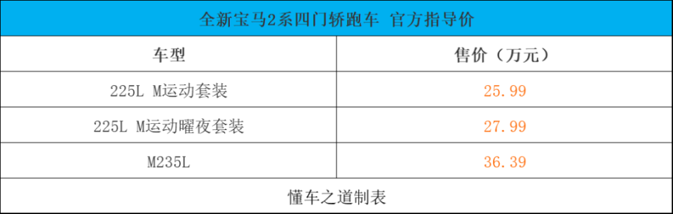 1月2日,全新寶馬2系四門轎跑車正式迎來上市,新車共推出3款車型,售價區(qū)間為25.99-36.39萬元。動力方面,新車將會全系配備2.0T發(fā)動機,其中225L車型發(fā)動機最大功率150kW(204馬力),傳動系統(tǒng)匹配7速雙離合變速箱,0-100km/h加速7.3秒;M235L發(fā)動機最大功率221kW(300馬力),傳動系統(tǒng)匹配7速雙離合變速箱,并配備M自適應(yīng)懸架和xDrive四驅(qū)系統(tǒng),0-100km/h加速5.0秒。