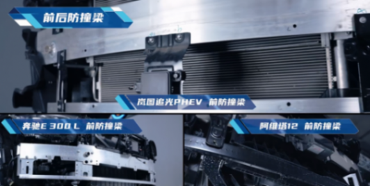 從前后防撞梁對比來看,定價超50萬的奔馳E 300 L還算沒讓消費者失望。以前防撞梁為例,三車均采用粗壯的鋁合金材質,奔馳E 300 L和追光PHEV的副防撞梁也用了鋁合金材質,且新E級的前防撞梁車頭覆蓋率還達到了93%。