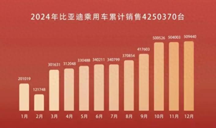 作為目前最亮眼的國產品牌,比亞迪在去年12月份銷售新車51.48萬輛,其中乘用車銷量為50.94萬輛,全年累計銷量為425.04萬輛,相比于去年301.29萬輛的成績,累計同比增長41.07%。