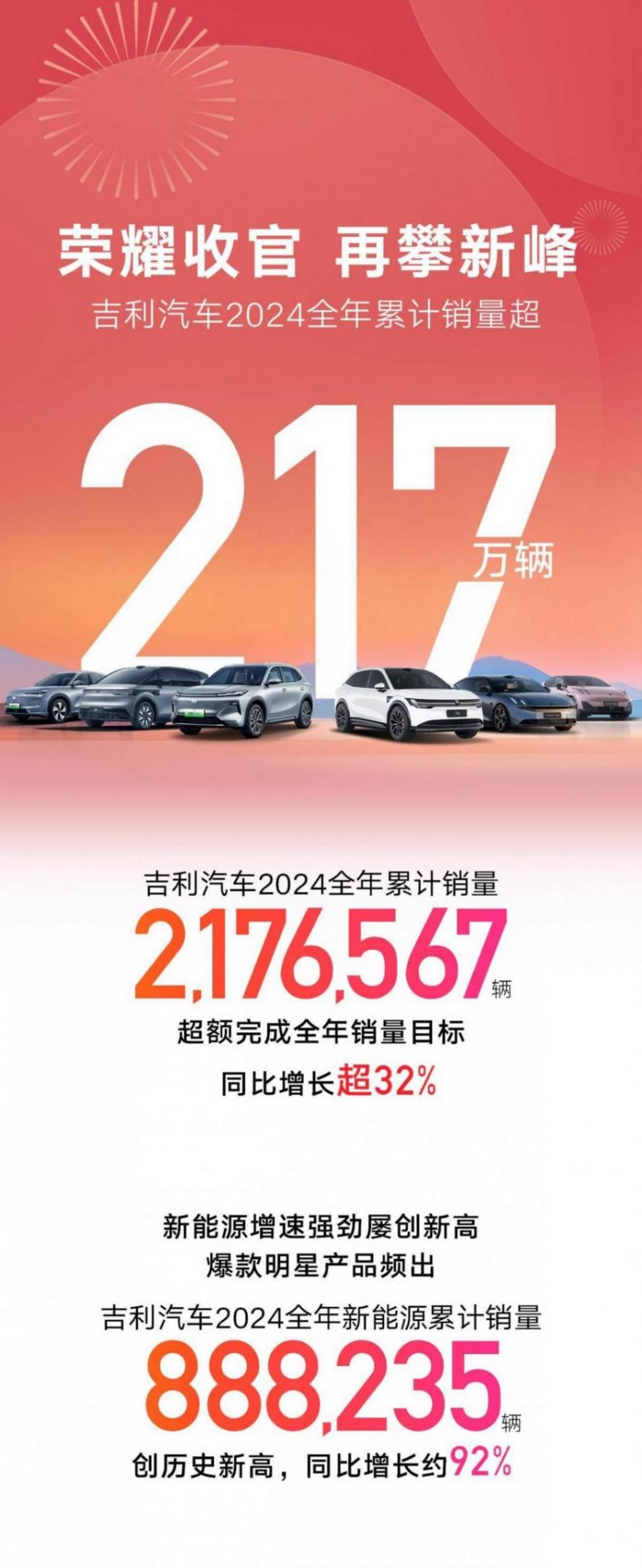 吉利汽車12月乘用車銷量210055輛,同比增長超43%,連續四個月銷量突破20萬輛。2024全年總銷量達2176567輛,同比增長超32%,超額完成全年銷量200萬目標,創年銷量歷史新高。
