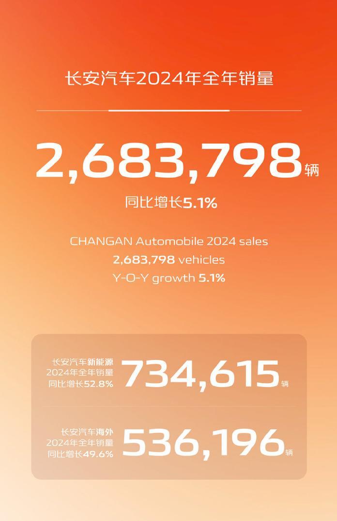 近日,長安汽車公布2024年12月份產銷快報,2024年12月新能源汽車銷量為9.13萬輛,1-12月累計銷量為73.46萬輛。12月總銷量為25.07萬輛,同比增加16.55%;1-12月累計銷量為268.38萬輛,同比增加5.12%。其中,自主品牌銷量為222.65萬輛,自主乘用車銷量為166.83萬輛,海外銷量為53.62萬輛。
