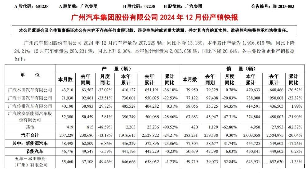 根據廣汽集團發布的2024年12月份產銷快報顯示,2024年全年,廣汽埃安(含昊鉑)年銷量為374884輛,同比下降21.9%;廣汽傳祺年銷量為414591輛,同比增長1.99%。