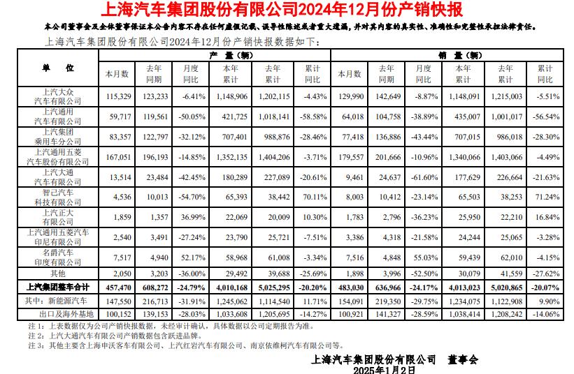 上汽集團2024年12月整車銷量合計為48.30萬輛,同比下降24.17%。數據顯示,上汽乘用車12月銷量77418輛,全年累計銷量70.7萬輛。名爵印度公司,12月銷量為7516輛,全年累計59439輛。與此同時,智己12月份全系銷量8003臺,全年累計65503輛。