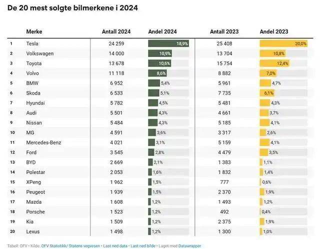 特斯拉以18.9%的市場份額穩(wěn)居第一,但銷量有所下滑。旗下的Model Y(16,858輛)、Model 3(7,264輛)是挪威最暢銷的兩款乘用車。大眾、豐田分列二三,市場份額超過10%。排名4-9位的依次是沃爾沃、寶馬、斯柯達、現代、奧迪、日產。