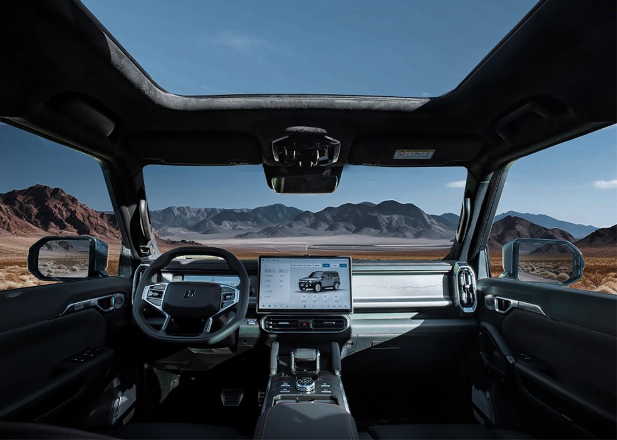 內飾部分的設計就有點同質化了,同樣是比較橫平豎直的中控臺造型,副駕前方還放置了一個固定扶手,越野氣氛渲染得不錯。中控屏尺寸為14.6英寸,基本的在線影音功能都有,變速箱換擋桿的設計很有機械感。