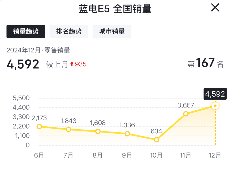 從這個層面來講,2024年11月份、12月份,藍電E5的市場處境顯然呈現出了明顯好轉的態勢。