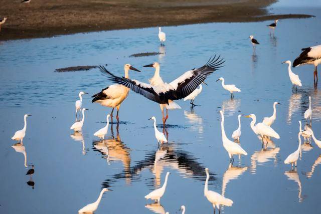 山東黃河三角洲國家級自然保護區(qū)悠閑覓食的國家一級保護野生動物東方白鸛