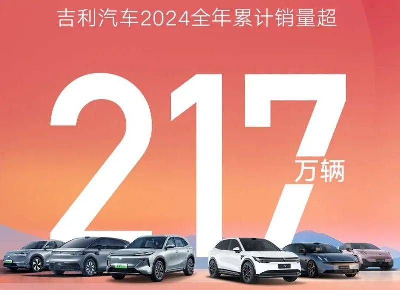 吉利汽車集團2024全年總銷量達2176567輛,同比增長超32%,超額完成全年銷量200萬目標,創年銷量歷史新高,12月乘用車銷量210055輛,同比增長超43%,連續四個月銷量突破20萬輛。
