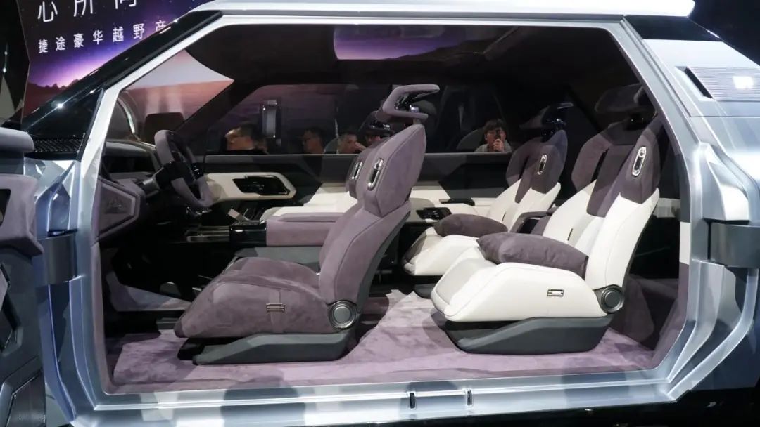 其中縱橫G700會是最先上市的,這車采用外掛式備胎,整體造型還是很硬朗的,尾燈采用的是燈幕形式,可以顯示不同圖案。車內部分,我們今天體驗的是6座布局,前排配備一塊帶魚屏,保留了實體按鍵,目前能看到的功能包括原地掉頭、中央差速器鎖和后橋差速器鎖、前排座椅通風加熱按摩等功能。