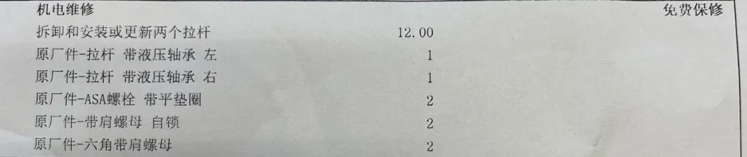 解決方案:經過4S店的排查,換了兩根前輪拉桿(如下圖工單)
