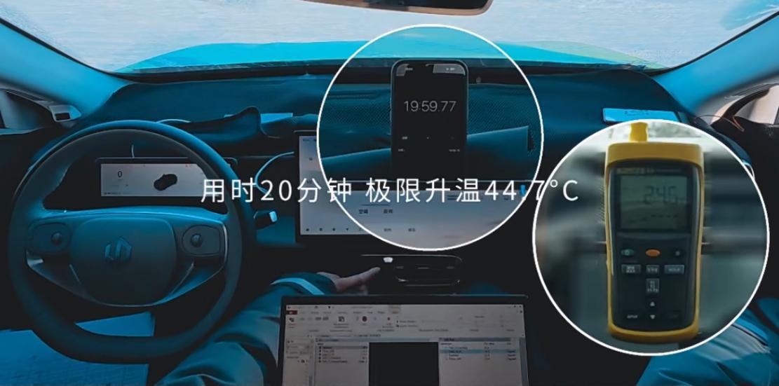 首先是空調測試,車輛放置戶外靜置12小時,室外-24度、車內-20.1度環境下,空調調節最高溫度、Auto檔,20分鐘極限升溫達44.6度。敲一下黑板,這是極限溫度,事實上,車內氣溫在十八九度就很舒適了,兩三分鐘就能達到,你可以采用遠程控制提前打開,進入車內就可以立刻享受到溫暖的體驗。值得一提的是,零跑的熱管理系統是完全不輸特斯拉的,做到27合1高度集成,將車輛各部件熱量利用到非常好的表現,零下30度還能高效工作。