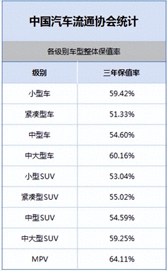 但在中國汽車流通協會的統計里,中國的緊湊型轎車的三年保值率卻是所有車型中最低的。中型轎車的保值率則在54.6%也不甚理想。