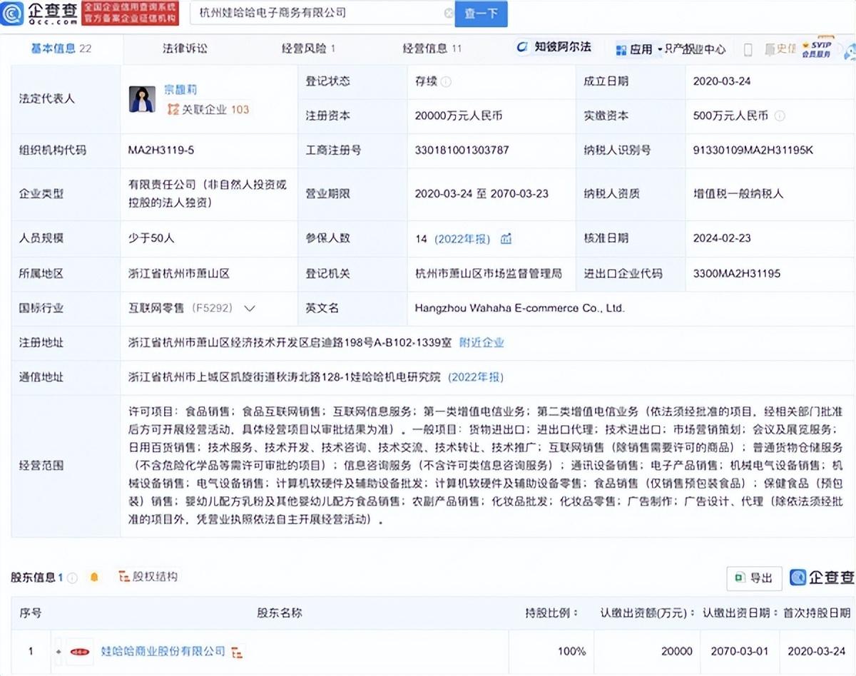 杭州娃哈哈電子商務有限公司成立于2020年,注冊資本2億人民幣,經營范圍含食品銷售、食品互聯網銷售、互聯網信息服務、普通貨物倉儲服務、農副產品銷售等,由娃哈哈商業股份有限公司全資持股。