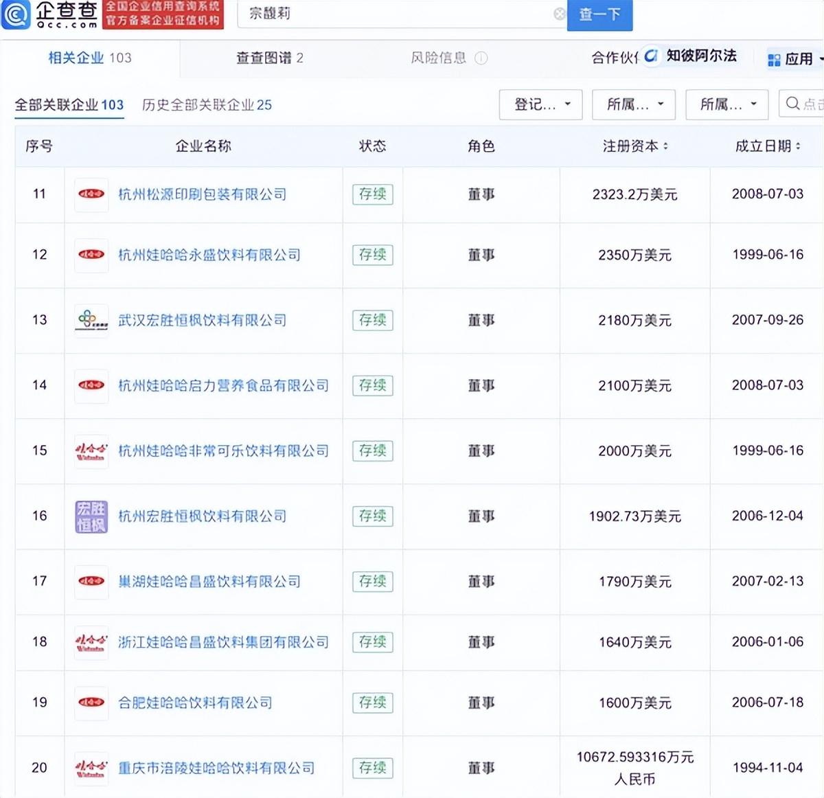 目前,宗馥莉已在上百家企業任職,其中多數為娃哈哈集團下屬公司。