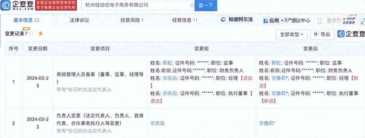查查APP顯示,近日,杭州娃哈哈電子商務有限公司發生工商變更,宗慶后卸任法定代表人、執行董事、經理,由其女兒宗馥莉接任。