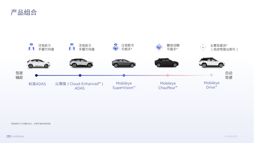 從目前Mobileye在自動駕駛領域的布局來看,其產品版圖覆蓋從ADAS到高階智駕再到完全自動駕駛的所有級別,包括標準ADAS、云增強ADAS、SuperVision、Chauffeur以及Drive。