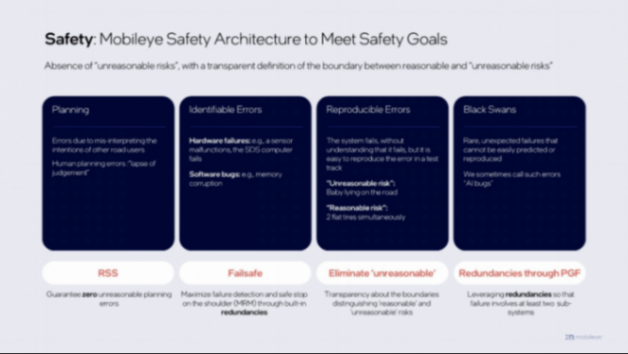 Mobileye在冗余系統設計方面的創新,可以說為整個自動駕駛行業的技術可靠性打開了一道可窺探的門。       在Mobileye提出的安全架構下,有四類錯誤需要規避和應對,即規劃類錯誤(planning),可復制型錯誤(reproducible errors),可識別型錯誤(identifiable errors),以及“黑天鵝”事件(black swans)。而冗余系統對于處理后兩類錯誤至關重要。