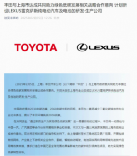 2025年2月5日,豐田汽車公司與上海市政府就共同助力中國社會綠色低碳發展相關舉措達成合作意向。豐田決定在上海市金山區成立LEXUS雷克薩斯純電動汽車及電池的研發·生產公司。該純電動汽車及電池公司為豐田獨資企業,預計純電動的雷克薩斯車型將在2027年投產。值得注意的細節有兩個,一是純電動汽車,二是豐田獨資企業。