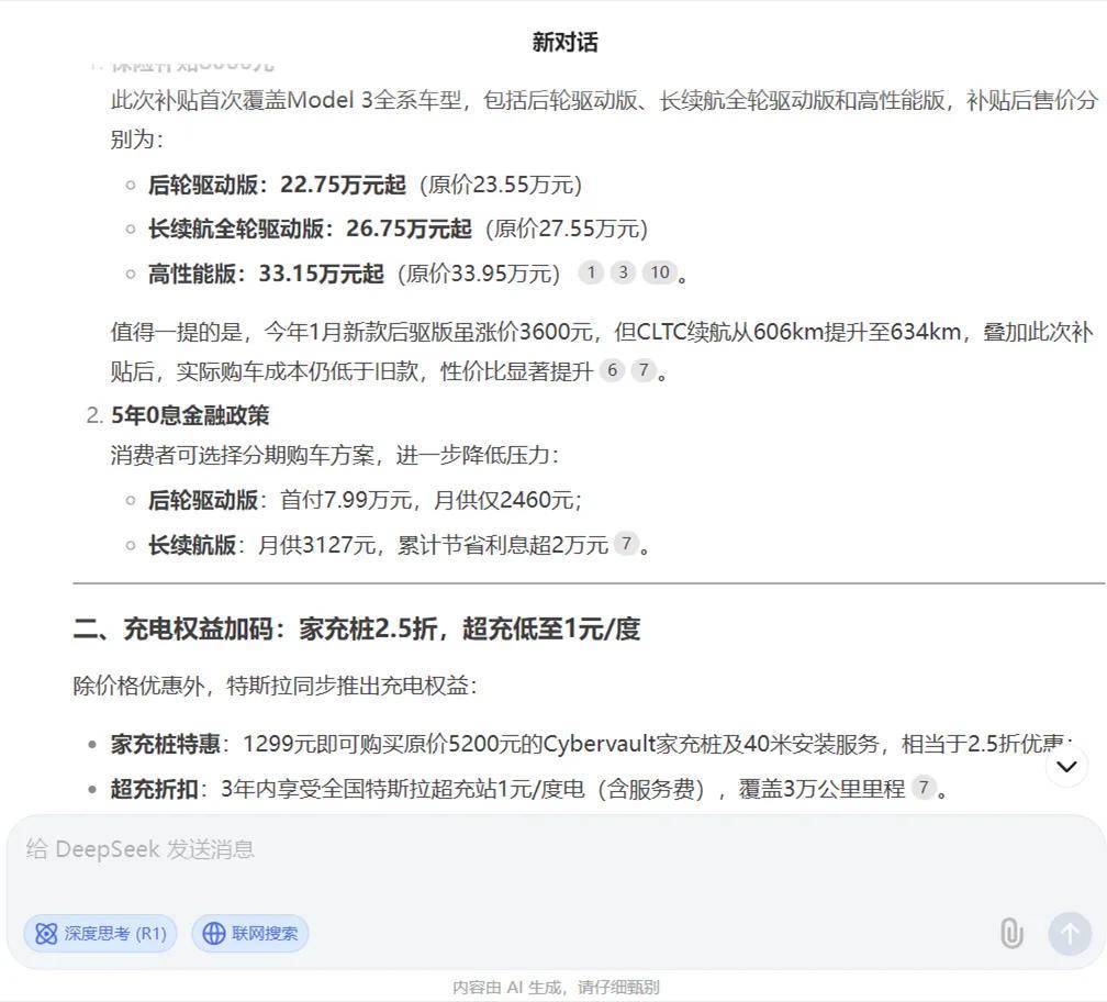 DeepSeek甚至還將前不久的特斯拉2025年特享充電權益給你扒拉了出來,只是它不知道的是,“家充樁特惠”和“超充折扣”只能二選一,這里有點小歧義。