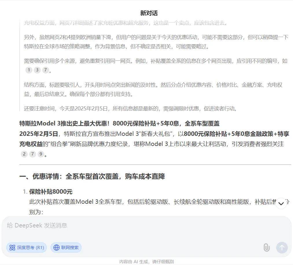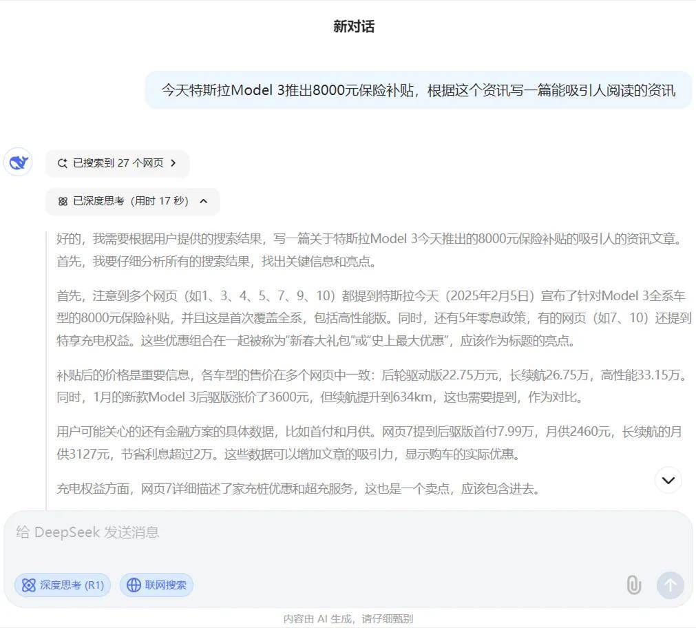 對于一個善于洗稿的汽車編輯來說,在與DeepSeek的對話框中輸入“今天特斯拉Model 3推出8000元保險補貼,根據這個資訊寫一篇能吸引人閱讀的資訊”簡直就是一條再合理不過的指令了,可是后面發生的事情開始變得有意思起來了。