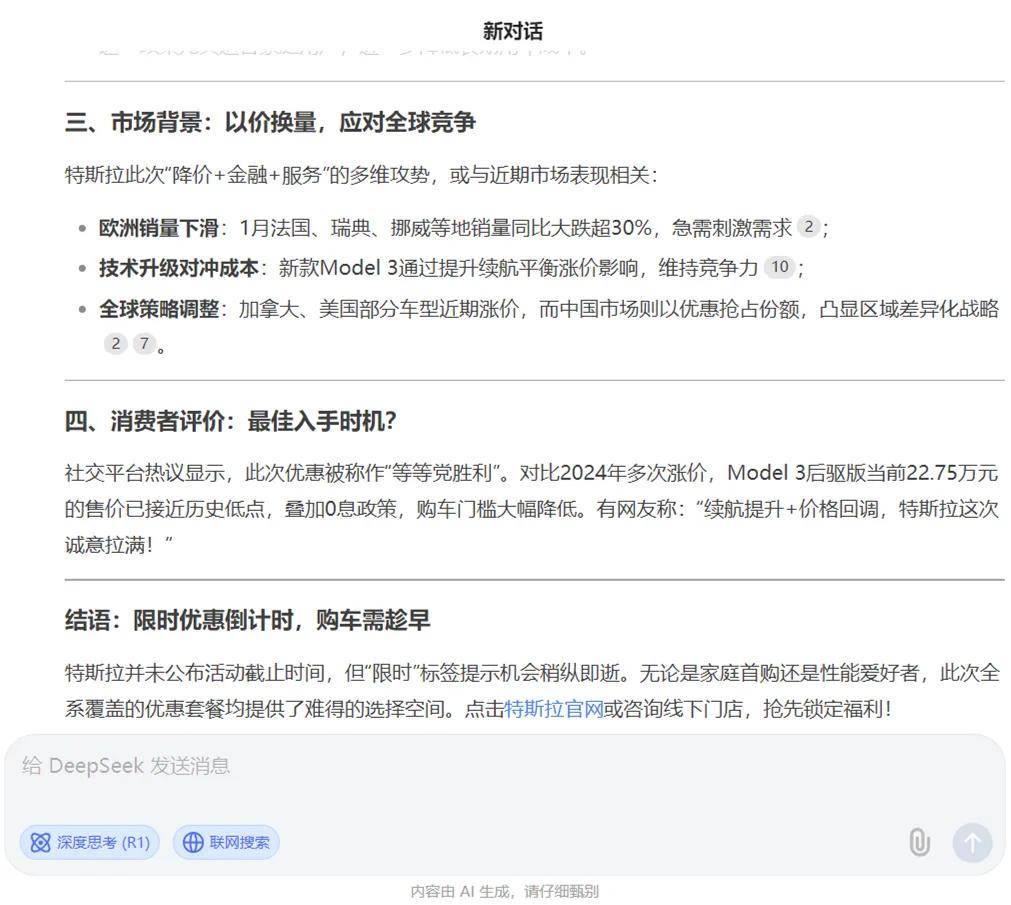 接著,DeepSeek竟然還淺淺地分析了一下這次特斯拉Model 3促銷的3點原因,你別說,還真的挺有道理,感覺分析得比一些剛入門的汽車編輯強。