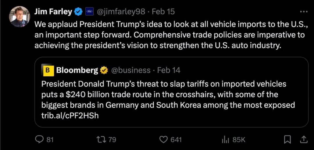 在他發表講話后,福特汽車公司CEO吉姆·法利(Jim Farley)在X上表示:“我們贊賞特朗普總統審查所有汽車進口的想法,這是向前邁出的重要一步。全面的貿易政策對于實現總統振興美國汽車業的愿景至關重要。”