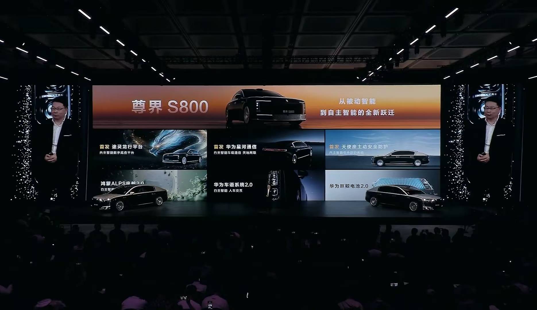 發布會上,余承東講解了包括首發途靈龍行平臺、首發天使座主動安全防護系統、首發華為星河通信、鴻蒙ALPS座艙2.0、華為車語系統2.0以及華為巨鯨電池2.0。