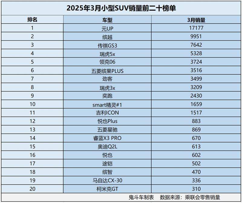銷量數據表現得更為清楚。日前,乘聯會發布3月汽車零售銷量數據,鬼哥整理出小型SUV市場銷量排名前二十的榜單,結果發現,這份榜單上,僅有一款車型3月零售銷量過萬,整體銷量表現并不強勁。