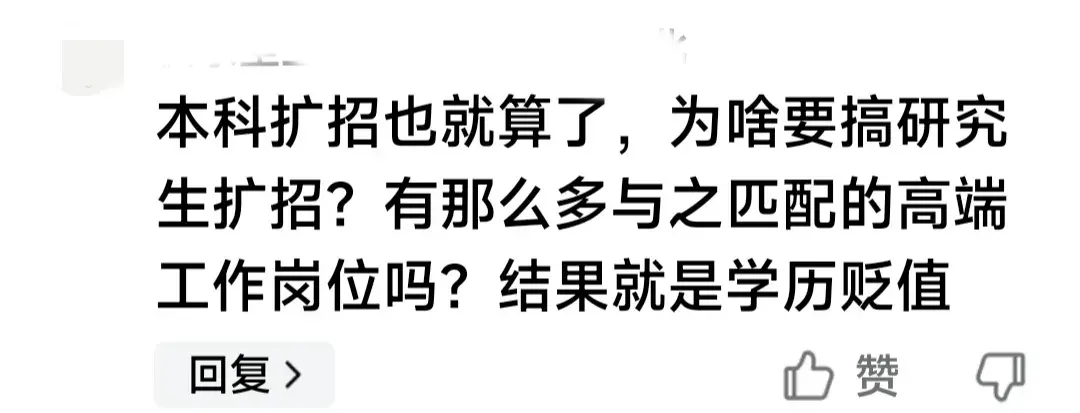這位網(wǎng)友表示為什么要擴招研究生呢?現(xiàn)在造成研究生貶值了。
