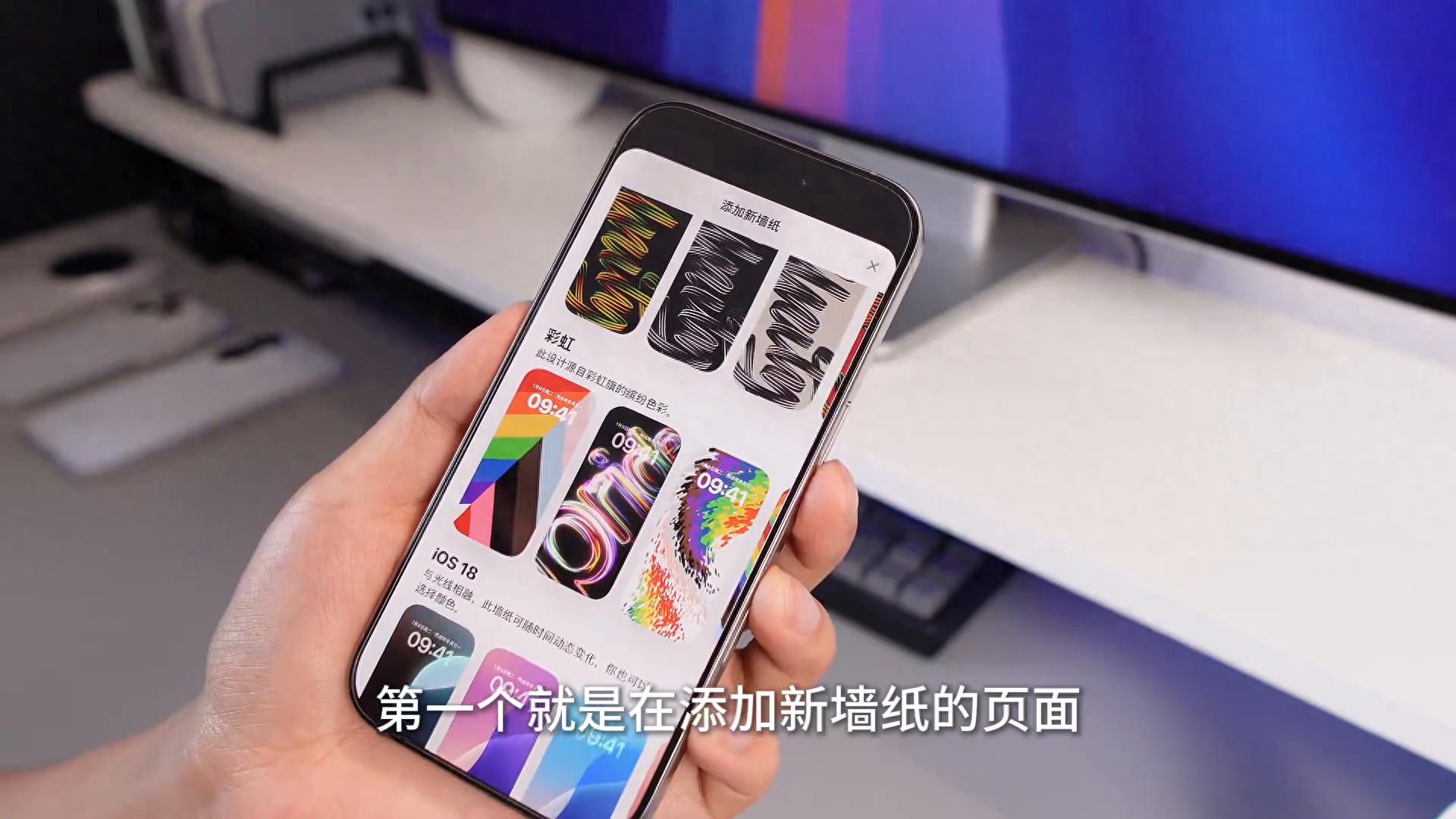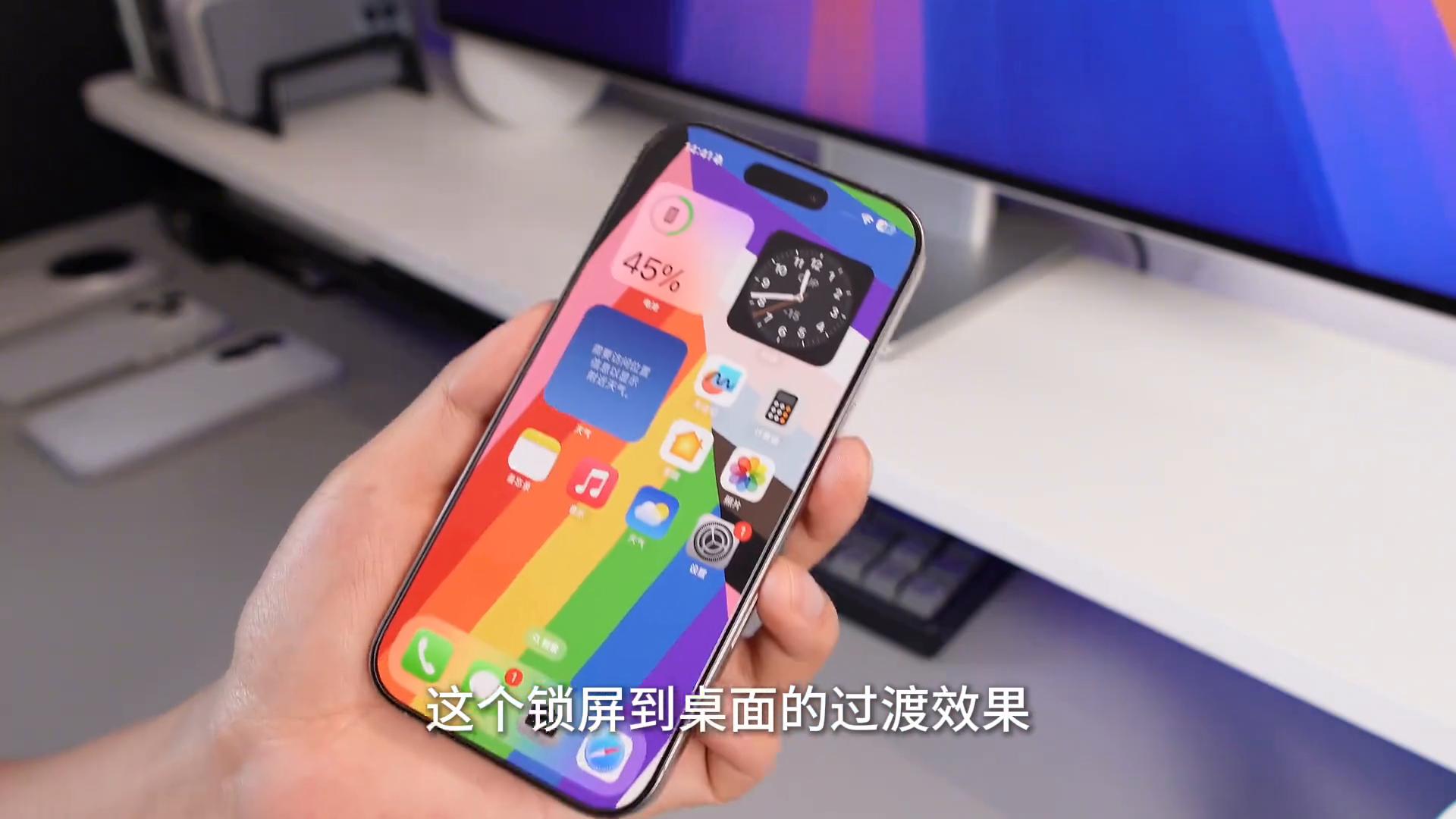 ·第一點(diǎn)就是在添加新墻紙的頁(yè)面新增了一套新的彩虹墻紙。當(dāng)把這套墻紙?jiān)O(shè)置為墻紙組合之后,效果就這個(gè)樣子了,它從鎖屏到桌面會(huì)有一個(gè)過(guò)渡效果。需要注意的是每次亮屏的時(shí)候,它的鎖屏壁紙都是有不一樣的色彩組合效果的。