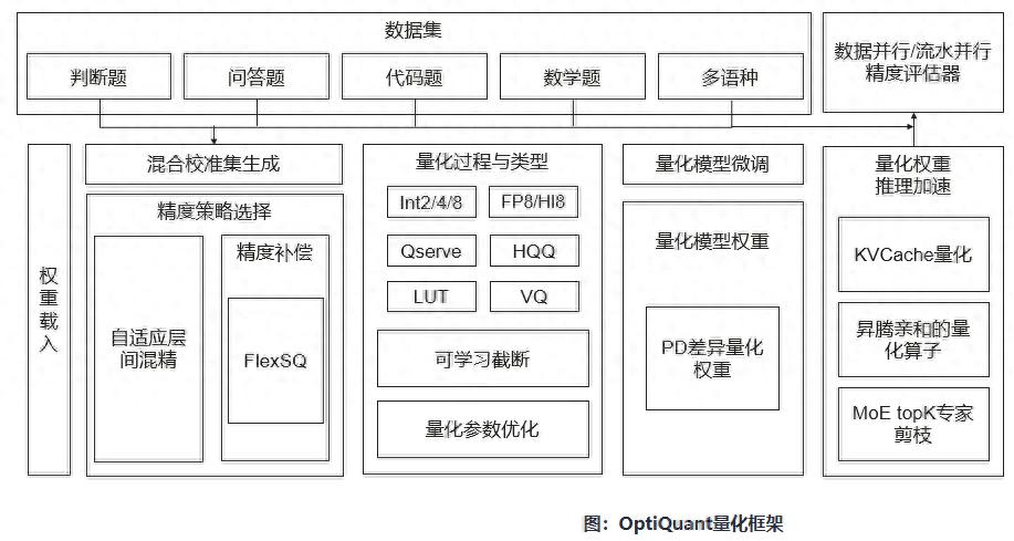 針對上述問題,華為提出了OptiQuant量化框架,一種高性能保精度量化方案,設(shè)計了層間自動混精、自動混合校準(zhǔn)、離群值抑制、可學(xué)習(xí)的截斷和SSZW參數(shù)量化算法。除了支持業(yè)界主流量化算法功能之外,它還新增支持三個功能:接入自定義量化算法和數(shù)值類型,可以將多種量化算法的自由組合搭配使用;支持業(yè)內(nèi)主流評測數(shù)據(jù)集和用戶自定義的數(shù)據(jù)校準(zhǔn)集;支持?jǐn)?shù)據(jù)并行和流水并行,針對不同大小的大語言模型實現(xiàn)精度驗證性能加速。