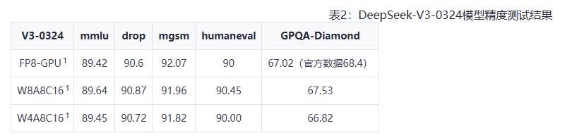 最終,基于Atlas 800I A2服務(wù)器的精度測試實驗結(jié)果顯示,對于DeepSeek-V3-0324模型,W8A8C16和W4A8C16均采用Per-channel量化,實現(xiàn)了推理精度與FP8-GPU持平。