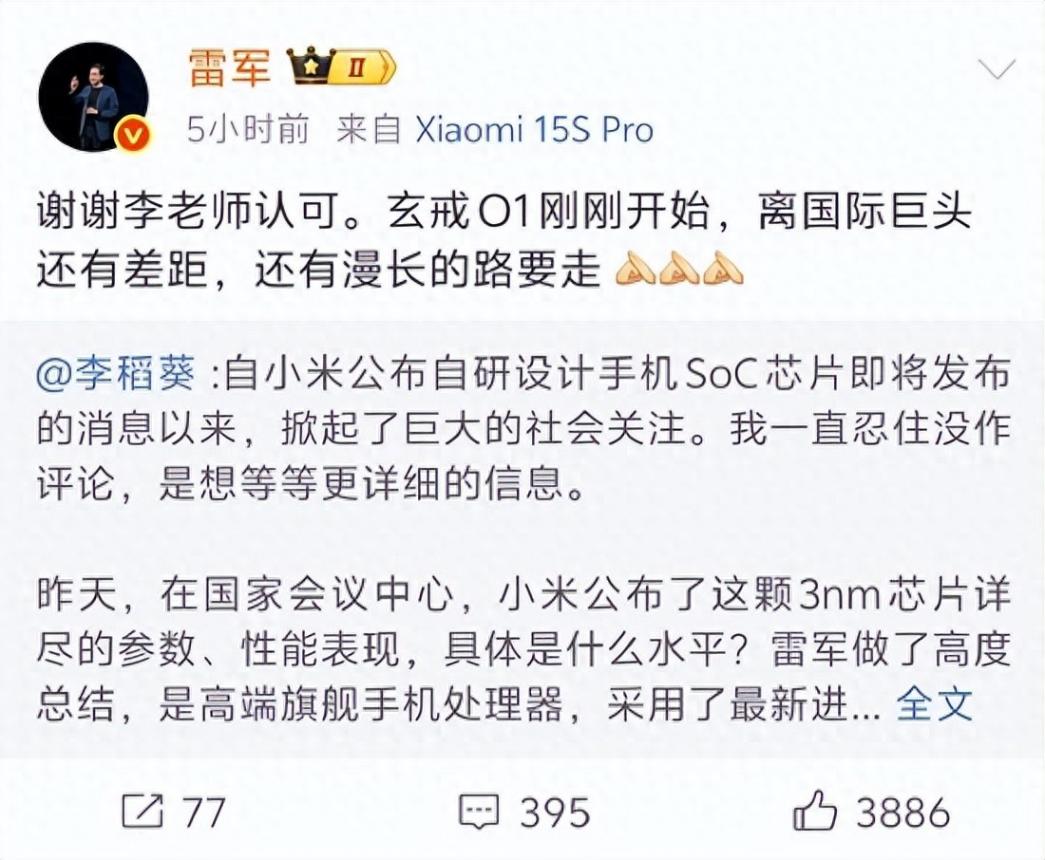 雷軍一天連發10條微博:小米玄戒O1離國際巨頭還有差距,還有漫長路要走!重新思考小米從哪里來,將往哪里去