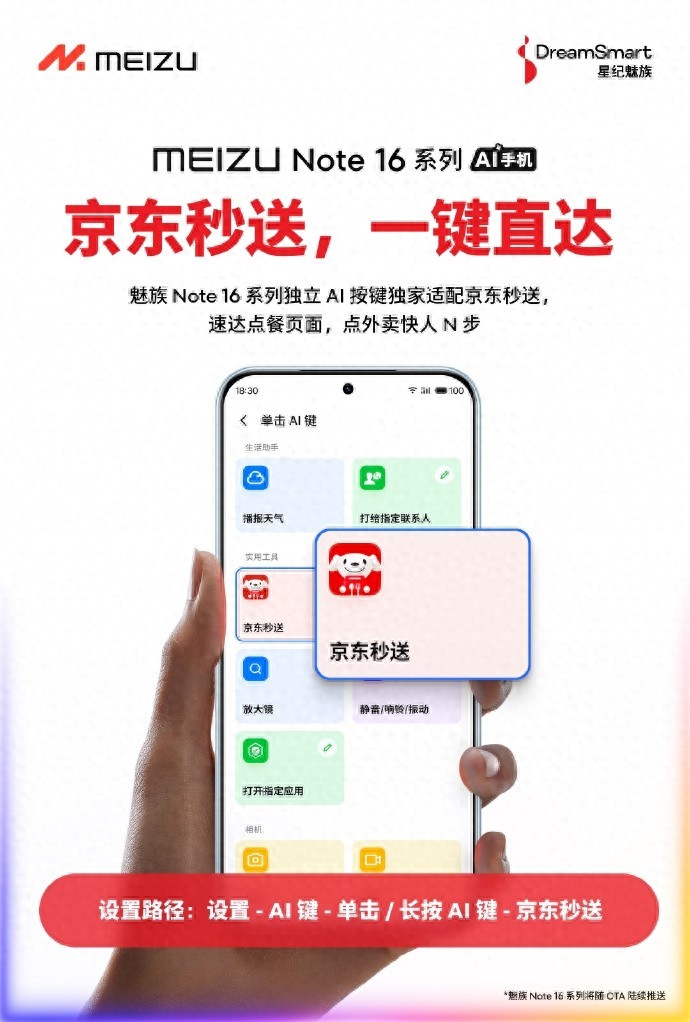 魅族 Note16系列手機不僅在性能上進行了全面升級,更在外賣服務(wù)上實現(xiàn)了突破。該系列手機搭載了獨立的AI按鍵,通過與京東的合作,用戶可以一鍵直達京東秒送服務(wù),實現(xiàn)外賣點餐的極速體驗。這意味著,無論是工作繁忙的白領(lǐng)還是宅在家中的年輕人,都能享受到比別人更快的外賣服務(wù),讓每一位魅族 Note16系列的用戶都能體驗到科技帶來的便利。