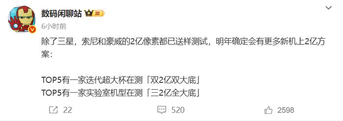 圖源:微博尤其是雙 2 億像素的配置,直接打破了目前市面上單顆 2 億像素的常規(guī)操作,例如三星 Galaxy S25 Ultra 主攝是 2 億像素,但其他鏡頭還是 1200 萬像素的 “弟弟” 配置。
