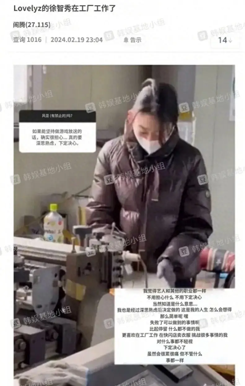 近日,一則關于前Lovelyz成員徐智秀的消息引起了廣泛關注。在女團解散后,徐智秀并沒有選擇安逸的生活,而是勇敢地投身于多元化的職業挑戰中。她不僅在演藝道路上不斷努力,更被目擊在工廠做女工,展現了她堅韌不拔的精神和對生活的熱愛。