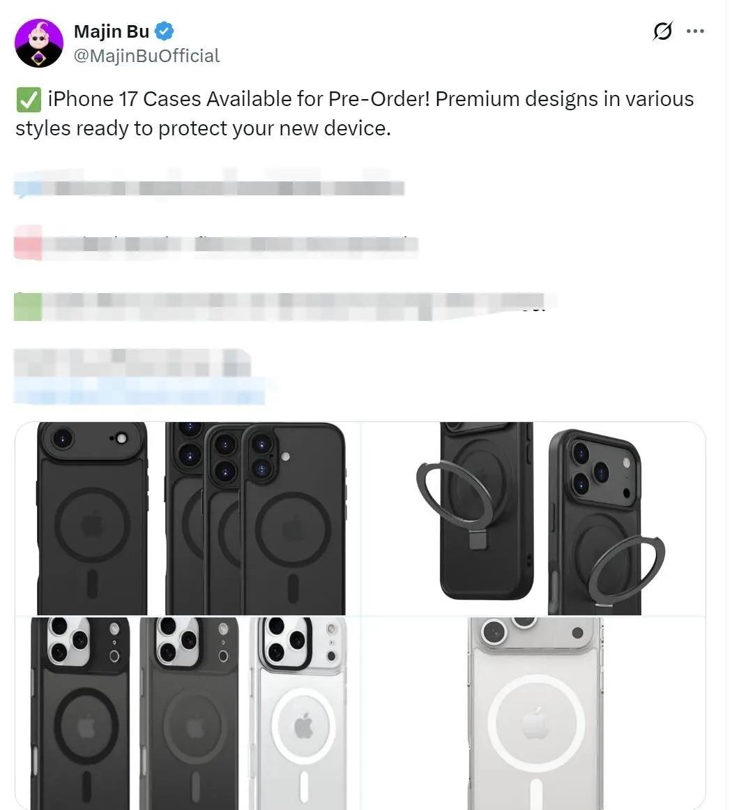 據海外爆料人@Majin Bu的最新消息,目前已有配件商開啟了iPhone 17系列手機殼的預購,相關手機殼具備磁吸和支架功能。