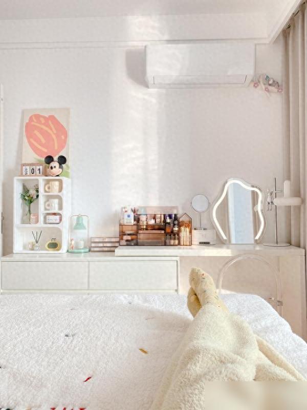 沒做復雜造型,就裝了懸空電視柜,白色柜體底部不留衛生死角,壁掛電視一掛,墻面清清爽爽。