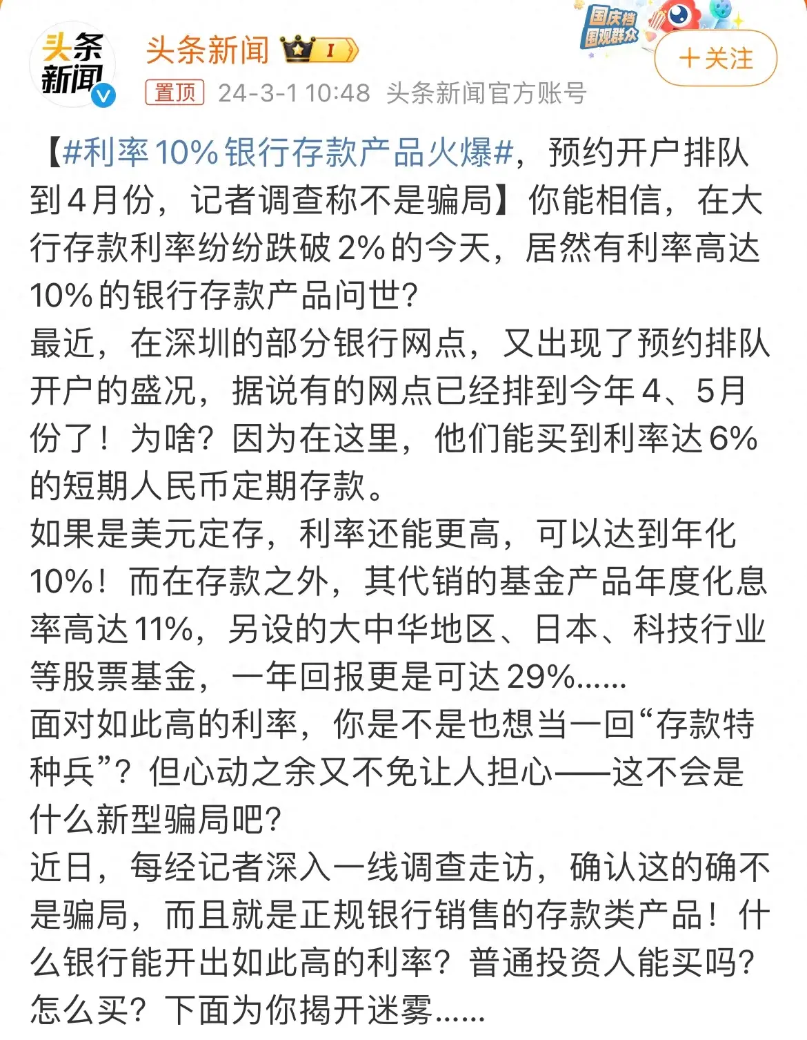 最近,在深圳的部分銀行網點,又出現了預約排隊開戶的盛況,據說有的網點已經排到今年4、5月份了!為啥?因為在這里,他們能買到利率達6%的短期人民幣定期存款。