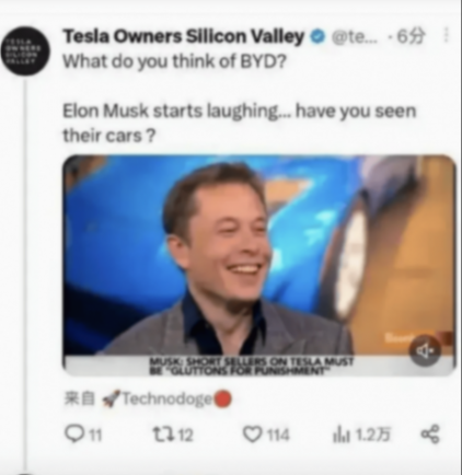 君記否,2011年汽車行業峰會上,狂傲的特斯拉在接受媒體采訪時,是如何睥視倨傲的態度,如何傲慢得讓人恨得牙癢癢的語言?尚未成為全球首富的馬斯克露出標志性的不屑神情,并且挑釁地反問:"你見過比亞迪的產品嗎?",繼而斬釘截鐵斷言:"我不認為他們能對行業格局產生影響。"