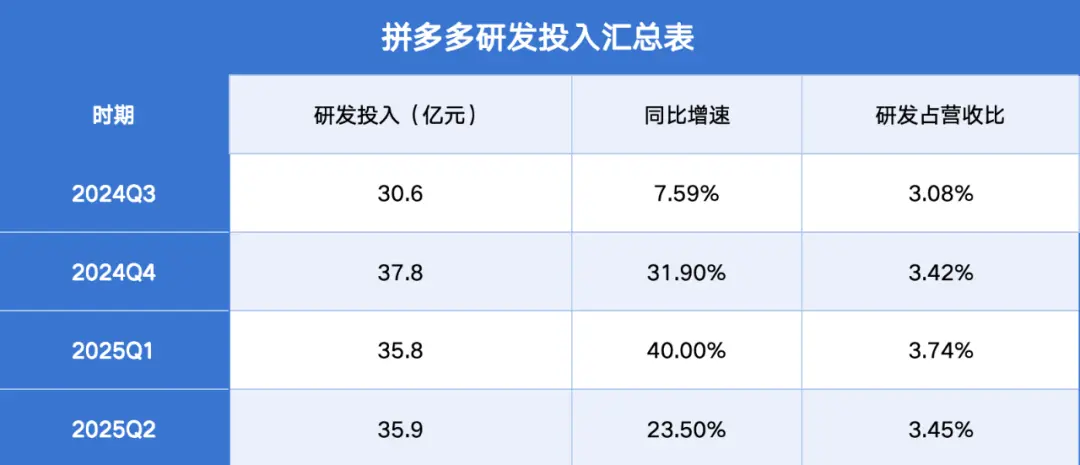 值得注意的是,盡管研發金額快速增長,但其研發占營收比重,始終控制在3%-4%區間,例如2025年一季度為3.74%,二季度為3.45%,體現了拼多多一貫強調效率與結果導向的技術投入思路。