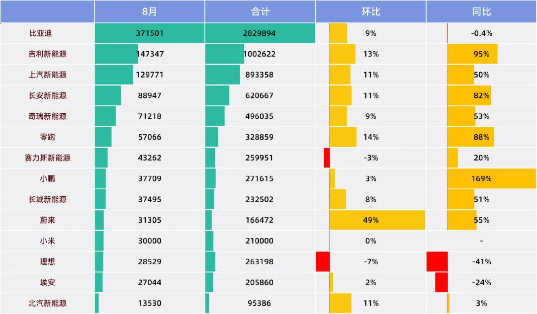 8月,車企依然是一超多強,分3個梯隊的格局。比亞迪依然是獨一檔,本月37.15萬臺的銷量,遙遙領先于競爭對手。
