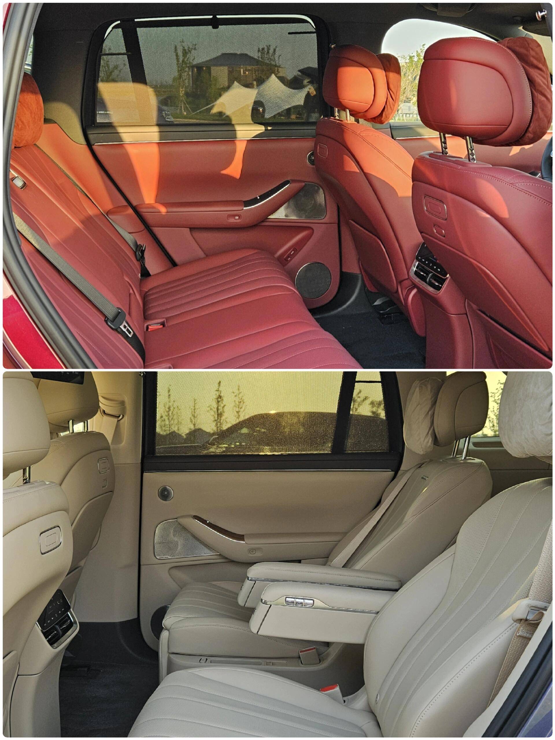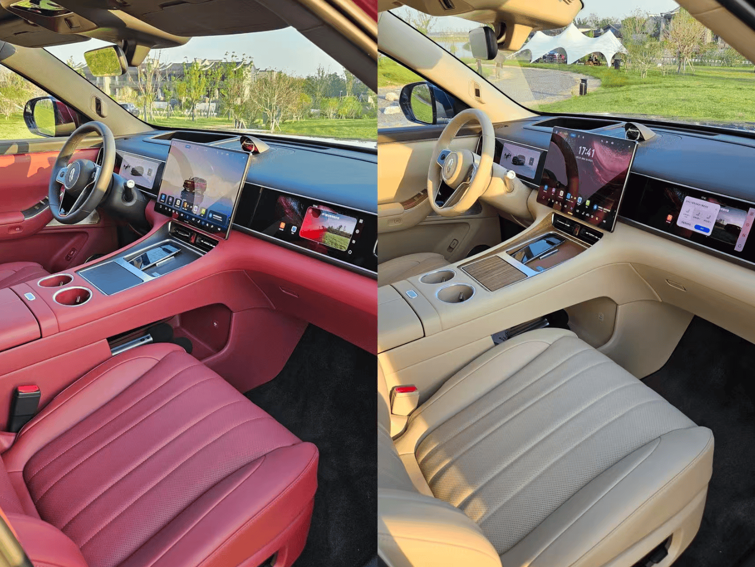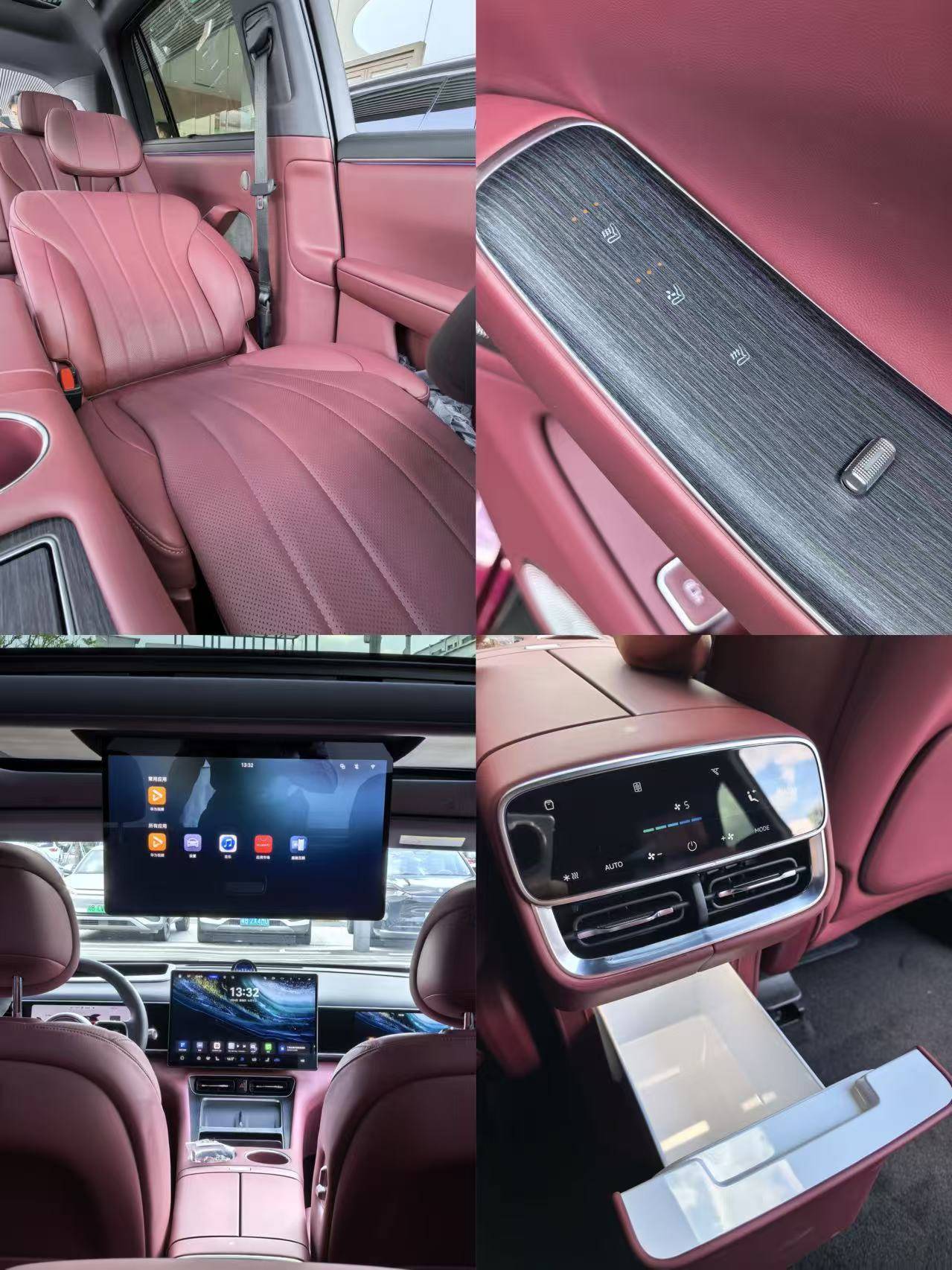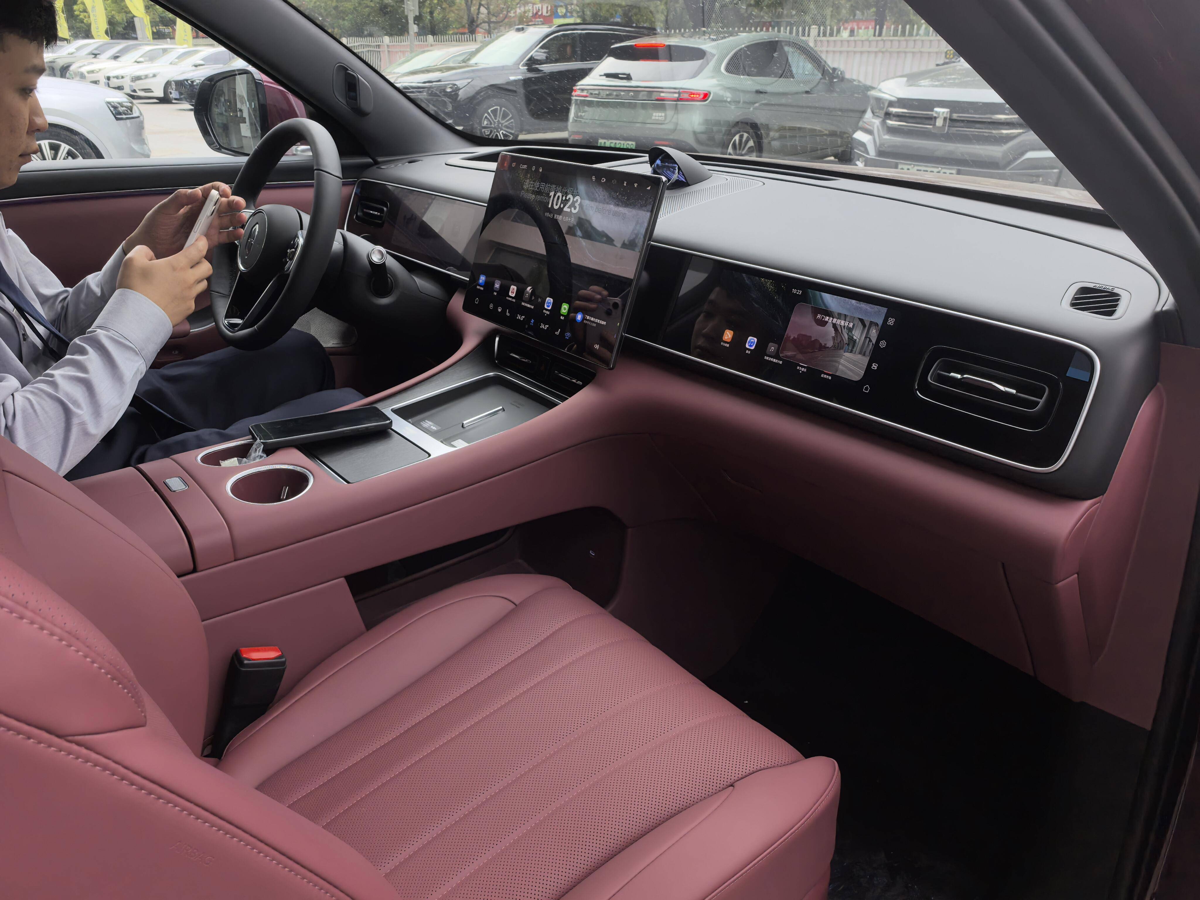 車內繼續提供5座以及2+2+2式的6座布局可選,前排主駕為零重力座椅(帶電動腿托),副駕為準零重力座椅,前后四座椅也均支持電動調節、加熱、通風、按摩等功能。其中,六座車型二排采用雙獨立座椅(右側零重力座椅),并新增17.3英寸后排娛樂屏、車載冷暖箱等舒適配置。
