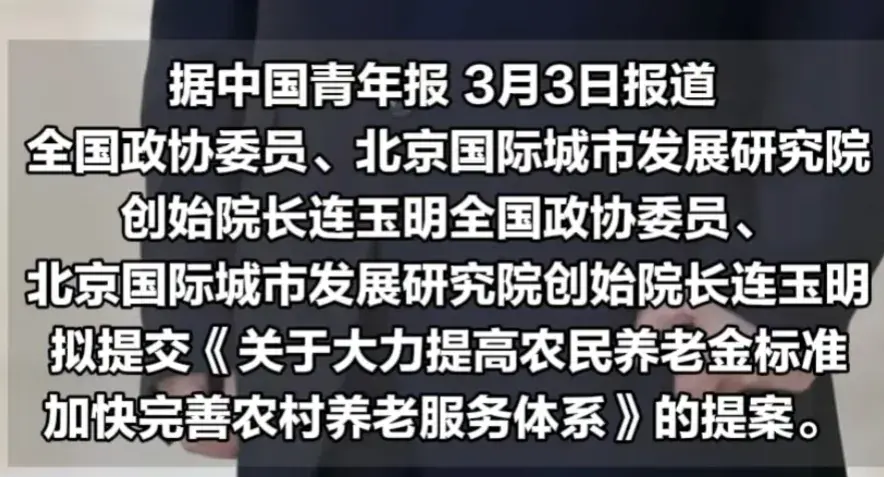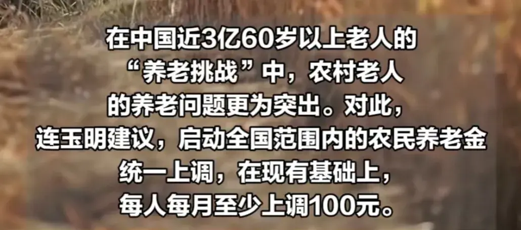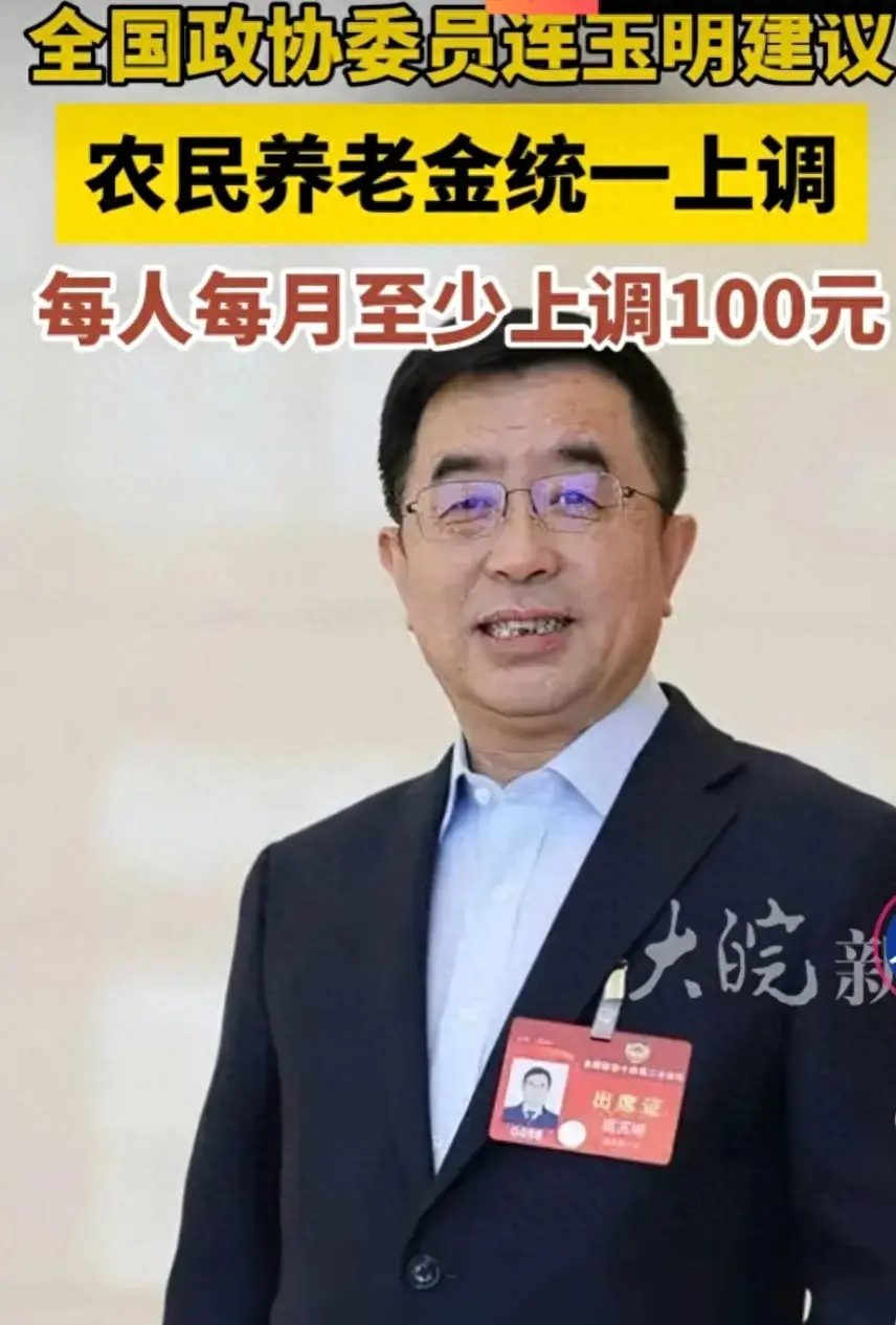 近日,全國政協(xié)委員連玉明提交了《關(guān)于大力提高農(nóng)民養(yǎng)老金標準加快完善農(nóng)村養(yǎng)老服務體系》建議:大力提高農(nóng)民養(yǎng)老標準,盡快啟動農(nóng)民養(yǎng)老金統(tǒng)一上調(diào),每人每月至少上調(diào)100元。