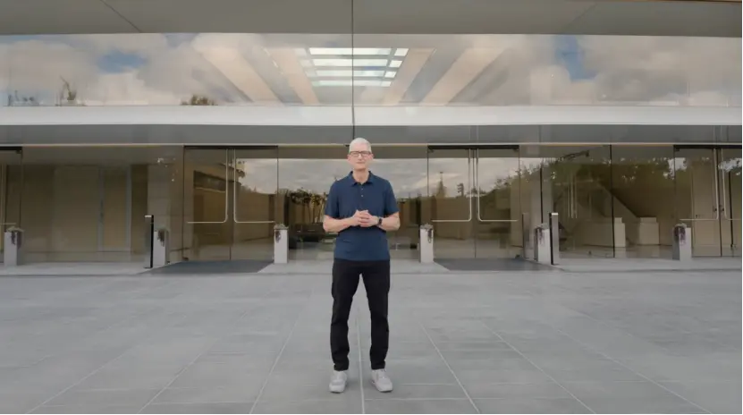當庫克出現在鏡頭里,一成不變的打招呼方式讓人有些審美疲勞,和去年相比,最大的變化就是庫克身后的背景從綠草坪和彩虹門,變成了蘋果總部。