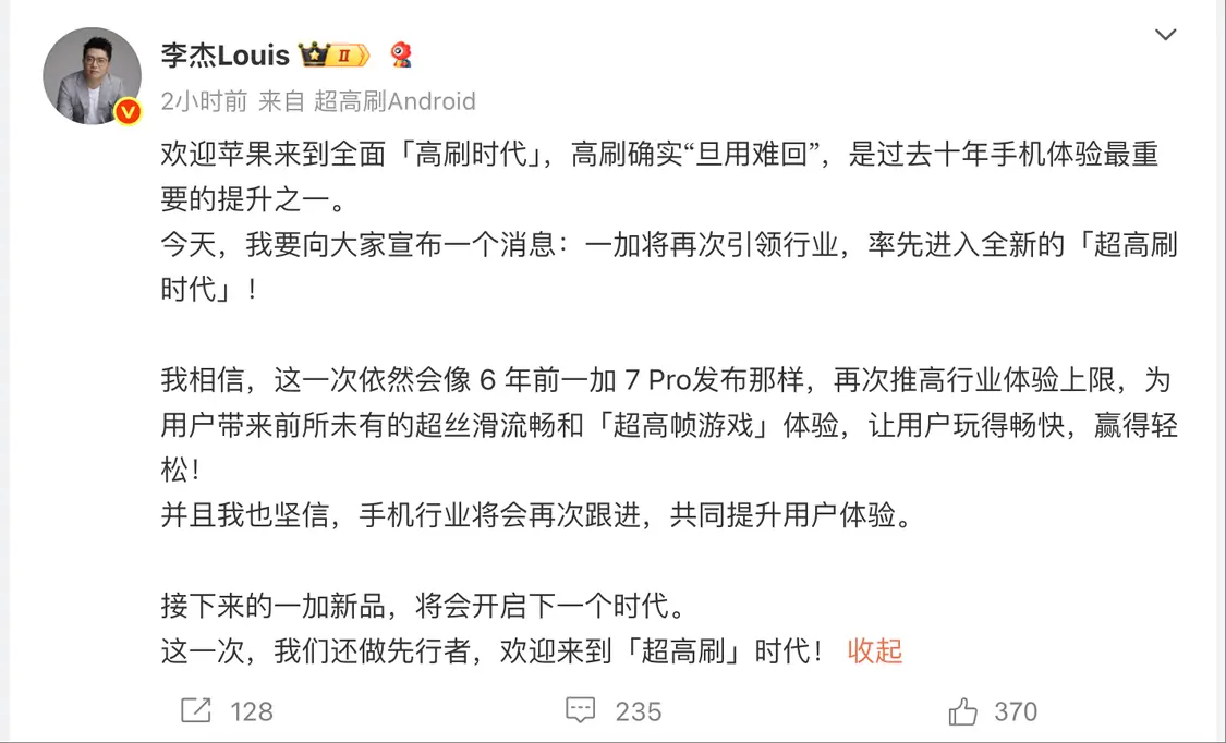 9月10日,一加中國區總裁李杰發文,歡迎蘋果來到全面“高刷時代”,高刷確實“旦用難回”,是過去十年手機體驗最重要的提升之一。