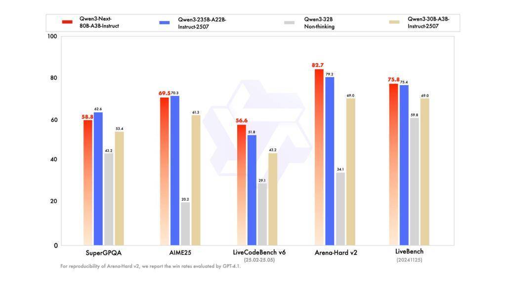 Qwen3-Next-80B-A3B-Instruct指令模型性能評測圖。來源:阿里通義